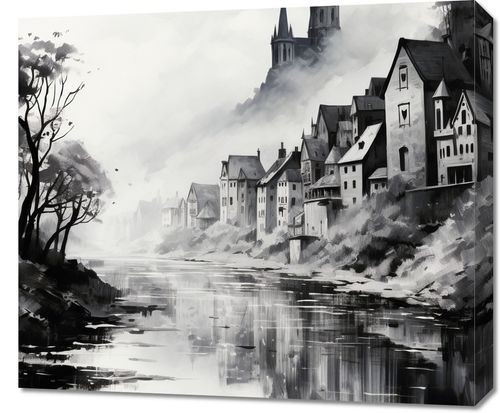 Obraz z serii pejzaże zatytułowany Mglisty Refleks. Misterne pociągnięcia pędzla przedstawiają starą wieś schowaną w mrocznych zakątkach gór, z dominującymi wieżami kościoła wznoszącymi się nad nią. Mgła otulająca krajobraz i odbicie w spokojnej wodzie tworzą atmosferę tajemniczości i zadumy. Monochromatyczna paleta barw dodaje głębi i intensywności całemu obrazowi, czyniąc go idealnym wyborem dla klasycznych salonów oraz miejsc takich jak kawiarnie o historycznym charakterze czy ekskluzywne kluby dyskusyjne.