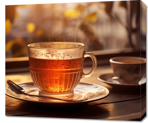 Obraz z serii wnętrza zatytułowany Moment Codzienności. Urokliwy obraz dwóch filiżanek herbaty, z których jedna uchwycona jest w chwili, gdy promienie porannego słońca przenikają przez jej bursztynową zawartość. Ciepłe światło i delikatna para unosząca się nad napojem emanuje atmosferę spokoju i przyjemności z porannego rytuału. Idealny do kuchni lub jadalni, aby dodać uczucie ciepła i domowego komfortu, a także doskonały jako prezent dla każdego miłośnika herbaty lub momentów refleksji.