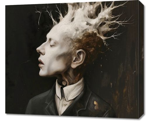 Obraz z serii abstrakcja zatytułowany Myśli Wzrastające prezentuje surrealistyczny portret mężczyzny, z którego głowy wyłania się skomplikowana struktura przypominająca korzenie lub gałęzie drzewa. Ten organiczny koronament wyrasta z myśli postaci, symbolizując rozwój, kreatywność i złożoność ludzkiego umysłu. Kontrast między żywą bielą i szarościami struktury a głębokim, ciemnym tłem sugeruje głębię i intensywność wewnętrznego świata postaci. Ten obraz może stanowić mocny wizualny akcent w przestrzeniach takich jak galerie, artystyczne pracownie, gabinety psychologiczne, a także we wnętrzach osób ceniących głębokie, filozoficzne refleksje.