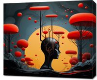 Obraz z serii pop art zatytułowany Myślokształty. Ten obraz przedstawia profil człowieka z głową pełną drzew, które wydają się być przedłużeniem jego myśli i świadomości, symbolizując połączenie umysłu z naturą. Drzewa mają formę fantastycznych, czerwonych kształtów przypominających grzyby, a ich rozgałęzienia łączą się z otaczającą atmosferą, z której unoszą się podobne formacje. Kontrastujące kolory, z dominującym czerwieniem i spokojnym tłem, tworzą wizualny dialog między rzeczywistością a wyobraźnią. Obraz zaprasza do refleksji nad bogactwem wewnętrznego świata i jego wpływem na percepcję zewnętrznej rzeczywistości, będąc wyjątkowym dodatkiem do każdego środowiska poszukującego głębi i inspiracji.