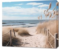 Obraz z serii pejzaże zatytułowany Nadmorski Most to tytuł tej zapierającej dech w piersiach ilustracji, która przemawia do duszy miłośnika morza. Delikatne trawy morskie tańczą w rytmie przybrzeżnego wiatru, a spokojne fale delikatnie docierają do złocistego piasku, tworząc melodię naturalnego spokoju. Nieskazitelnie błękitne niebo przechodzące w pastelowe odcienie na horyzoncie dodaje głębi i przestrzeni, tworząc obraz idealny do umieszczenia w przestrzeniach, które celebrują ciszę i kontemplację. Ten obraz będzie wyjątkowym dodatkiem do każdej plażowej chaty, salonu nadmorskiego domu, a nawet biura, przypominając o nieskończonej przestrzeni i wolności, jaką oferuje morze.