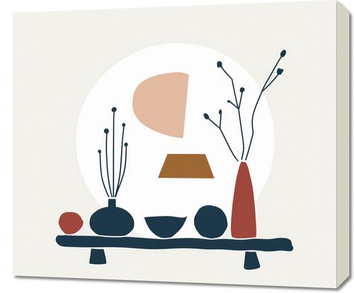Obraz z serii boho zatytułowany Naturański Stół. Obraz to subtelna i uporządkowana prezentacja natury w stylizowanej, niemal scenicznej formie. Abstrakcyjne kształty w ciepłych i stonowanych kolorach przedstawiają wazony i rośliny na tle geometrycznych form przypominających wschód i zachód słońca. Kompozycja na neutralnym tle łączy sztukę z naturą w spójnym, współczesnym stylu. Dzieło to będzie idealnym uzupełnieniem wnętrz, w których ceniona jest prostota, ale jednocześnie szukających ciepła i naturalności. Może znaleźć miejsce w domowych salonach, jadalniach, lub jako urokliwy element w przestrzeniach biurowych, wniosąc odrobinę uroku i artystycznego nastroju.