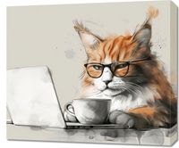 Obraz z serii abstrakcja zatytułowany Nie przed Kawusią. Przedstawia uroczy obraz kota o rudym umaszczeniu, który nosi okulary i wydaje się być zaczytany w ekranie laptopa. Scena jest przedstawiona w ciepłych, nasyconych barwach, które podkreślają miękkość i puszystość futra kota. Elementy graficzne, takie jak plamy i rozpryski farby, nadają kompozycji artystycznego charakteru. Filiżanka kawy umieszczona obok laptopa dodaje codziennej atmosfery, sugerując, że może to być obrazek z domowego biura lub miejsca relaksu. Ten obraz mógłby być idealnym elementem dekoracyjnym dla miłośników kotów i tych, którzy cenią sobie humor oraz lekkość w aranżacji swojego wnętrza, zarówno w domowym biurze, jak i w przestrzeni wypoczynkowej.
