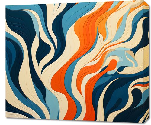 Obraz z serii abstrakcja zatytułowany Oceaniczne Fale. Hipnotyzujący wir barw przypominający przemieszczające się fale oceanu, w których błękit miesza się z głęboką granatową otchłanią i akcentami ciepłego, płonącego ognia. Te złożone wzory płynnie przechodzą w jedną całość, tworząc wizualny spektakl, który zaprasza do głębokiej kontemplacji. Kontrastujące kolorowe pasma dodają obrazowi dynamiki i witalności. Doskonale sprawdzi się w nowoczesnych biurach o minimalistycznym wnętrzu oraz w przestrzeniach publicznych, takich jak galerie sztuki czy kawiarnie o awangardowym designie.