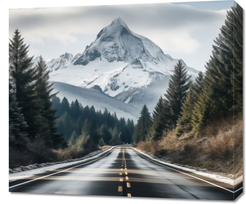 Obraz z serii pejzaże zatytułowany Odważna Podróż, przedstawia majestatyczną górę wyłaniającą się z pośród ciemnozielonych drzew iglastych, które wyznaczają drogę prowadzącą w kierunku jej śnieżnego szczytu. Siła i niezachwiana postawa góry w połączeniu z miękkimi konturami puchowych chmur nad nią tworzą doskonałą równowagę między wytrwałością a delikatnością. Czarna, wilgotna nawierzchnia drogi, rozświetlona światłem odbijającym się od jej wilgotnej powierzchni, prowadzi wzrok obserwatora wprost do serca dzikiej przyrody. Kontrast między ciemnymi drzewami a bielą śniegu dodaje dziełu głębi i tajemniczości. Ten obraz będzie idealnym dodatkiem do wnętrz o tematyce przygodowej i eksploracyjnej, jak również doskonałym wyborem dla przestrzeni biurowych firm turystycznych lub agencji podróżniczych, gdzie może inspirować i przypominać o majestacie i pięknie niezbadanych zakątków świata.
