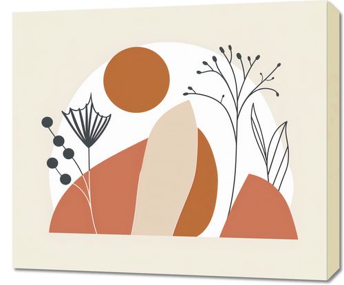 Obraz z serii boho zatytułowany Organiczny Splot. Obraz składa się z serii organicznie ułożonych form i linii, które wspólnie tworzą abstrakcyjną interpretację pejzażu przyrodniczego. Centralnym elementem jest duże, okrągłe słońce w ciepłym, rustykalnym odcieniu pomarańczu, które rozświetla scenę. Pod nim rozmieszczone są wzory roślinne o delikatnych konturach i bardziej intensywnej czerni, które wyłaniają się z zaokrąglonych wzgórz w odcieniach brązu i beżu. Te botaniczne elementy nadają kompozycji dynamiki, tworząc przy tym wrażenie głębi i struktury. Obraz wydaje się oddawać spokój i urok naturalnego krajobrazu, idealnie nadając się do przestrzeni, które pragną przywołać odrobinę natury wewnątrz, takich jak minimalistyczne salony, spokojne przestrzenie biurowe, czy przytulne zakątki domowego zacisza.