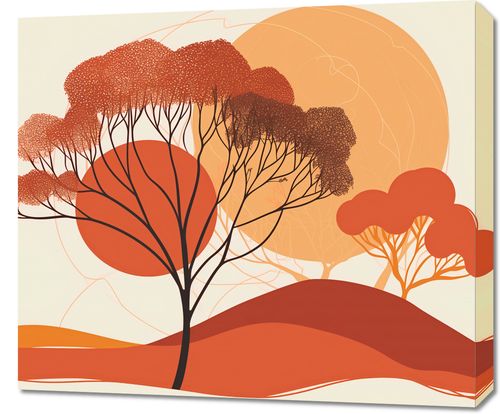 Obraz z serii minimalistyczne zatytułowany Ostatnie Promienie Słońca. Prezentuje stylizowany krajobraz z akcentami ciepłej, jesiennej kolorystyki, gdzie dominują głębokie odcienie czerwieni i pomarańczy, skontrastowane z delikatnymi liniami drzew i sylwetkami wzgórz.Ten obraz będzie pięknie wyglądał w pomieszczeniach, gdzie dominują ciepłe barwy, drewno oraz naturalne tkaniny, dodając im głębi i wyrazistości. Idealny do salonów, przestrzeni wypoczynkowych, a także biur kreatywnych, gdzie może zainspirować i przynieść odrobinę ciepła oraz przytulności.