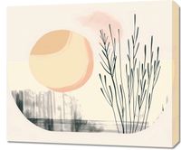 Obraz z serii boho zatytułowany Pastelowy Wschód. Obraz ukazuje subtelny, linearny rysunek roślinności na tle dużego, pastelowego słońca i delikatnie zaznaczonych elementów krajobrazu. Kompozycja w pastelowych, ciepłych barwach tworzy wrażenie spokojnego wschodu słońca, który rozświetla delikatne kontury roślin i miękkie formy w tle. Obraz ten idealnie wpasuje się do wnętrz o stonowanej kolorystyce, gdzie może dodać odrobinę ciepła i subtelnego charakteru. Doskonale nadaje się do sypialni, salonów, czy innych miejsc odpoczynku, gdzie wprowadzi łagodny nastrój i poczucie wyciszenia.
