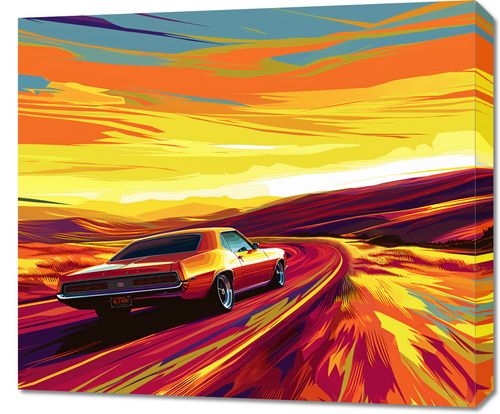 Obraz z serii abstrakcja zatytułowany Pędź Przed Siebie. Prezentuje klasyczny samochód w stylu muscle car, przemierzający pejzaż w kolorach zachodzącego słońca. Dynamiczne linie i żywe barwy od żółci, przez pomarańcz, aż po głębokie czerwienie tworzą wrażenie szybkości i wolności. Sylwetka samochodu, wyraźnie odznaczająca się na tle rozmytych kolorów, podkreśla moc i energię jazdy. Ten obraz idealnie wpasuje się w przestrzenie pełne dynamiki i pasji, takie jak garaże, salony gier, prywatne kina domowe lub nowoczesne salony. Doda on charakteru wnętrzu, inspirując do aktywności i cieszenia się każdą chwilą.
