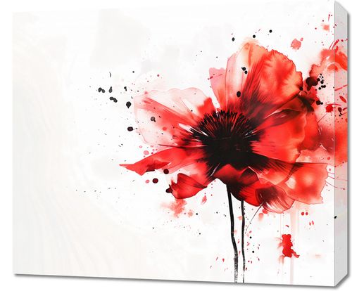 Obraz z serii abstrakcja zatytułowany Płynna Akwarela. Na obrazie przedstawiony jest kwiat w stylu akwarelowym, z dominującą czerwoną paletą barw, która przechodzi w mocne akcenty czerni w centrum kwiatu. Obraz ma dynamiczny i spontaniczny charakter, co podkreślają rozbryzgi i krople farby rozchodzące się wokół kwiatu. Przypomina to efekt plamy, który dodaje kompozycji artystycznego wyrazu i energii. Kontrast między delikatnymi czerwieniami a głęboką czerń centrum kwiatu przyciąga wzrok i czyni obraz bardzo wyrazistym. Tło jest jasne z subtelnie zaznaczonymi plamami, co dodatkowo akcentuje dramatyzm i piękno przedstawionego kwiatu.