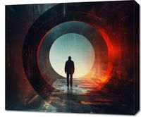 Obraz z serii pop art zatytułowany Portal do Świata. Obraz przedstawia tajemniczą postać stojącą na końcu długiego, ciemnego korytarza, który prowadzi do jaskrawo oświetlonego, okrągłego otworu. Otoczenie jest industrialne, z elementami wyglądającymi na zużyte i zardzewiałe, co sugeruje opuszczoną lub dystopijną przestrzeń. Czerwono-neonowe akcenty wzdłuż korytarza tworzą wrażenie głębi i podkreślają centralną perspektywę. Światło emanujące z końca tunelu jest jasne i kontrastujące, co może symbolizować nadzieję, nieznane lub nowy początek. Ten obraz mógłby znaleźć swoje miejsce w nowoczesnych przestrzeniach życiowych lub komercyjnych, które chcą wprowadzić elementy science fiction lub skłaniać do refleksji nad przyszłością i możliwościami, które ona przynosi.