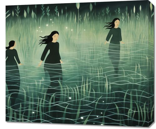 Obraz z serii wnętrza zatytułowany Pośród Ciszy, przedstawia grupę postaci kobiecych, poruszających się z gracją przez mglisty, oniryczny krajobraz. Zanurzone po kolana w wodzie, otoczone przez zielone, eteryczne trawy i dyskretnie świecące światła, postacie emanują spokojem i tajemniczością. Styl obrazu, z jego płynnymi liniami i spokojnymi odcieniami zieleni, tworzy uczucie medytacyjnej głębi i harmonii z naturą. Ten obraz idealnie nadaje się do wnętrz, które pragną odzwierciedlić głęboką spokojność i introspekcję, takich jak pokoje medytacyjne, strefy relaksu, domowe biblioteki, a także jako subtelny akcent w przestrzeniach publicznych, gdzie zachęca do chwili wytchnienia i refleksji.