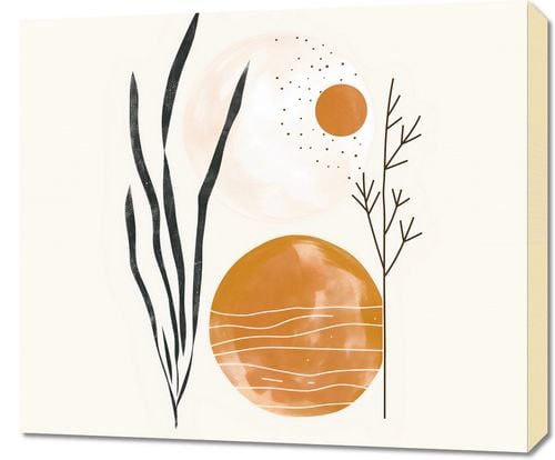 Obraz z serii wnętrza zatytułowany Przebłysk. Obraz prezentuje abstrakcyjną kompozycję o spokojnej, naturalnej kolorystyce, z dominującymi odcieniami beżu, pomarańczu i czerni. Centralne miejsce zajmują dwa okręgi, które mogą symbolizować słońce i księżyc lub inne astronomiczne ciała, z subtelnymi detalami przypominającymi krążki planetarne lub satelity. Obok nich znajdują się stylizowane rośliny lub trawy, które swoją smukłą formą i ciemnym kolorem tworzą kontrast wobec jaśniejszego tła. Dodatkowy element graficzny w postaci gałęzi z prostymi liniami przypomina drzewo lub krzew, dodając kompozycji organicznego charakteru. Całość jest utrzymana w stylistyce minimalizmu, z delikatnymi teksturami i rozpryskami, które nadają dziełu lekkości i nowoczesnego wyglądu. Ograniczona paleta barw oraz proste formy sugerują spokój i harmonię, co czyni obraz odpowiednim dla przestrzeni, które mają za zadanie inspirować do wyciszenia i refleksji.