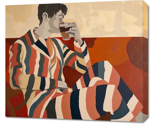 Obraz z serii abstrakcja zatytułowany Przerwa Aby Odetchnąć. Prezentuje postać mężczyzny w paskowanym szlafroku, zatopionego w degustacji filiżanki herbaty. Stylizacja grafiki nawiązuje do modernistycznej estetyki z użyciem geometrycznych kształtów i ograniczonej palety barw, co nadaje scenie spokojny i zrelaksowany nastrój. Ciepłe odcienie czerwieni i brązów w tle kompozycji podkreślają atmosferę intymności i domowego ciepła. Ten obraz idealnie wpasuje się w przestrzenie takie jak salon, biblioteka, czy przytulne zakątki do czytania i odpoczynku. Może także stanowić inspirujący akcent w kawiarniach lub herbaciarniach, gdzie zachęca do chwili oddechu i cieszenia się chwilą.