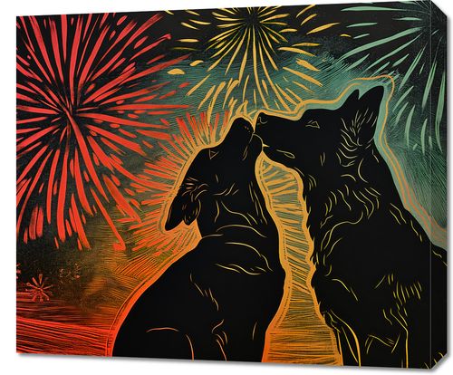 Obraz z serii abstrakcja zatytułowany Psi Uścisk. Przedstawia on dwie sylwetki psów, które wydają się być zwrócone ku sobie w gest podobny do uścisku, na tle intensywnie kolorowego nieba z fajerwerkami. Barwy od czerwieni po żółcie i zielenie tworzą tło, które wygląda jak nocne niebo w trakcie świętowania. Styl graficzny jest dynamiczny i pełen energii, a linie tworzące sylwetki psów są płynne i wyraziste. Ten obraz wyraża radość i nieodłączną więź pomiędzy zwierzętami, będąc doskonałym dodatkiem do wnętrz, gdzie chcemy podkreślić ciepło i pozytywne emocje.