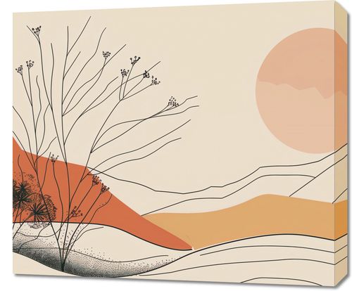 Obraz z serii boho zatytułowany Pustynna Wydma. Obraz ukazuje krajobraz z delikatnie zarysowanymi roślinami na tle łagodnych, pustynnych wydm. Spokojna kolorystyka, opierająca się na miękkich odcieniach beżu, pomarańczy i czerwieni, oddaje kojący klimat zmierzchu. W tle widoczne jest wielkie, ciepłe słońce, które rzuca złoty blask na całą scenę, nadając jej harmonijny charakter. Ten obraz będzie piękną dekoracją do wnętrz, które pragną wprowadzić elementy natury w połączeniu z minimalistycznym designem. Jego uspokajające barwy i proste linie idealnie wpasują się w przestrzenie takie jak sypialnie, salony, miejsca odpoczynku, czy nawet biura kreatywne, pragnące wykreować przestrzeń sprzyjającą relaksowi i inspiracji.
