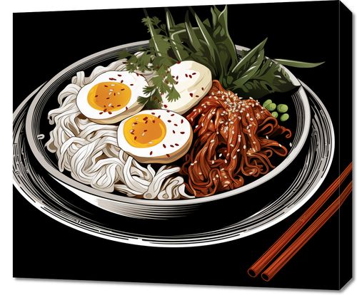 Obraz z serii wnętrza zatytułowany Ramen w Sztuce. Ta apetyczna ilustracja przedstawia klasyczną miskę ramenu, w której harmonijnie komponują się ułożone białe nudle, soczyste półmiski jajka, pikantne kiełki i świeże zielone warzywa, wszystko oprawione w wyraziste akcenty sosu i przypraw. Intensywne kolory i precyzyjne detale rysunku, od czerwonych pałeczek po lśniące składniki, celebrują estetykę i smak tradycyjnego japońskiego dania. Plakat ten wniesie do każdej przestrzeni, od kuchni po jadalnie, ducha nowoczesnego designu i miłości do kulinarnych przyjemności.