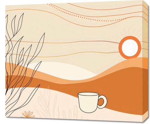 Obraz z serii minimalistyczne zatytułowany Ranna Pora. Obraz przedstawia stylizowany, spokojny krajobraz pustynny z wschodzącym słońcem, które emanuje ciepłem, barwiąc niebo w pastelowe odcienie. Ponad łagodnymi, falującymi wzgórzami widnieją delikatne linie, które mogą przypominać ciepłe prądy powietrza lub subtelne ozdoby. Na pierwszym planie znajduje się filiżanka kawy, umieszczona tak, jakby była częścią pustynnego terenu, co dodaje scenie element codziennego rytuału i spokoju. Obraz jest pełen ciepłych, ziemiście beżowych i pomarańczowych odcieni, które wprowadzają atmosferę relaksu i spokoju. Idealnie pasuje do przestrzeni wypoczynkowych, takich jak kawiarnie, salony, czy pokoje do odpoczynku, gdzie może pomóc stworzyć przytulne i spokojne otoczenie. Dzieło to z pewnością będzie przyciągać wzrok, będąc subtelny jednocześnie.