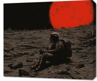 Obraz z serii abstrakcja zatytułowany Samotność w Kosmosie przedstawia astronautę siedzącego na pustkowiu księżycowym, z ogromną czerwoną gwiazdą w tle. Osamotniony kosmonauta wygląda na zamyślonego lub odpoczywającego, otoczony przez surowy, nierówny krajobraz księżycowy, z jego charakterystycznymi kraterami i szczytami. Obraz emanuje głębokim spokojem i izolacją, podkreślając zarówno piękno, jak i nieprzewidywalność przestrzeni kosmicznej. Wyrazisty kontrast między ciemnymi skałami a jaskrawą gwiazdą podkreśla dramatyczną aurę tej sceny. Ten obraz idealnie nadawałby się do dekoracji ścian w domowych biurach lub przestrzeniach edukacyjnych, inspirowanych tematyką kosmiczną.