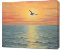 Obraz z serii pejzaże zatytułowany Serenada Nieba. Ten olśniewający obraz przedstawia moment, gdy ostatnie promienie dnia malują niebo w odcienie pomarańczy i różu, a pojedynczy ptak szybuje w stronę zachodzącego słońca. Morze rozciąga się aż po horyzont, odbijając złote światło, które nadaje scenie poczucie nieskończoności i spokoju. Doskonale nadaje się do wnętrz, które aspirują do stworzenia atmosfery spokoju i refleksji, takich jak salony, pokoje wypoczynkowe, czy przestrzenie wellness i spa.