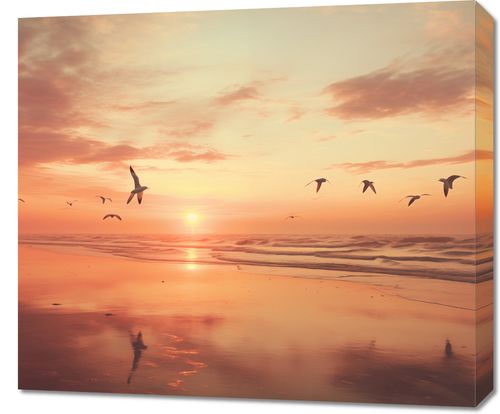 Obraz z serii pejzaże zatytułowany Spokojna Przystań przedstawia idylliczny wschód słońca nad morzem, gdzie złociste promienie światła tańczą po delikatnie falującej powierzchni wody. Sylwetki mew unoszących się na ciepłym powietrzu dodają uczucia wolności i bezkresu. Rozmyte odbicia ptaków na mokrym piasku nadmorskim wzbudzają uczucie spokoju i kontemplacji. Ten obraz jest kwintesencją ukojenia, idealny do wnętrz o tematyce nadmorskiej, czy to w prywatnych rezydencjach pragnących złapać oddech od miejskiego zgiełku, jak i w przestrzeniach wellness, spa, czy hotelowych lobby, gdzie głównym celem jest relaks i odprężenie.