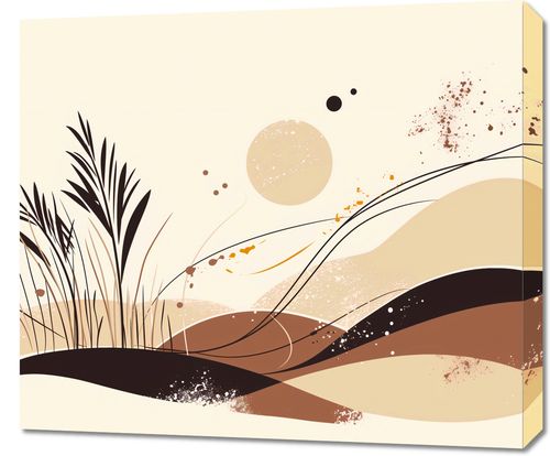Obraz z serii minimalistycznej zatytułowany Szept Gwizdu. Widać na nim stylizowaną kompozycję z trawami i kształtami, które mogą przywoływać na myśl górskie krajobrazy. Barwy są ciepłe i naturalne, z dominującymi beżami, brązami oraz akcentami w kolorze terakoty.Ten plakat doskonale uzupełni wnętrza w stylu boho, skandynawskim, jak również te o bardziej rustykalnym czy naturalnym charakterze. Jego spokojna paleta kolorów i subtelna grafika sprawią, że będzie idealnym dodatkiem do sypialni lub salonu, wprowadzając atmosferę relaksu i spokoju.