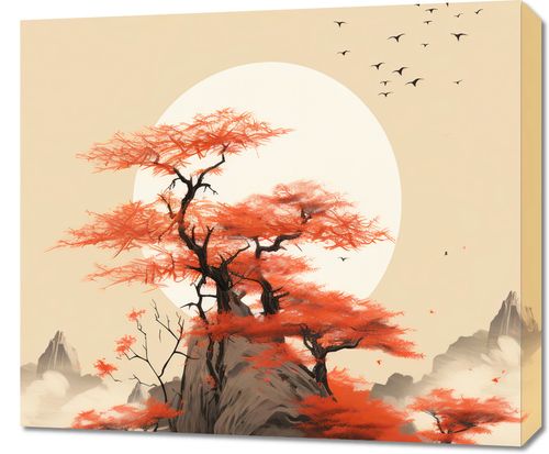 Obraz z serii pejzaże zatytułowany Szepty Wiatru. Niesamowity krajobraz z jaskrawo czerwonymi drzewami rosnącymi na majestatycznej skale, której kształty wydają się być ukształtowane przez wieki. Błyszczący biały księżyc oświetla spokojne wody, które otaczają skale, podczas gdy stado ptaków przenika przez jasne niebo, dodając uczucie przestrzeni i nieskończoności. Subtelne odcienie szarości i biele w tle tworzą kontrast dla wyrazistych czerwieni drzew, nadając scenie głębię i dramatyzm. Idealny do ozdoby salonów medytacyjnych, gabinetów terapeutycznych lub luksusowych hotelowych holów.