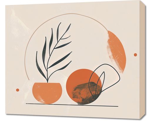 Obraz z serii boho zatytułowany Tonacja Pasteli. Obraz przedstawia harmonijną kompozycję elementów natury i abstrakcyjnych kształtów. Widzimy doniczkę z delikatną rośliną o czarnych, smukłych liściach, które delikatnie kontrastują z ciepłym odcieniem pomarańczy naczynia. Towarzyszą jej geometryczne formy: dwa krągłe kształty w tonacji ziemi, które przeplatają się, tworząc iluzję przestrzeni i głębi. Rysunek uzupełnia subtelna linia horyzontu i rozproszone kropki, dodające plakatowi dynamiki. Idealnie sprawdzi się jako element dekoracyjny w pomieszczeniach, gdzie dominuje spokój i równowaga, takich jak jasne, przestronne salony, pokoje do medytacji lub ciche zakątki bibliotek.