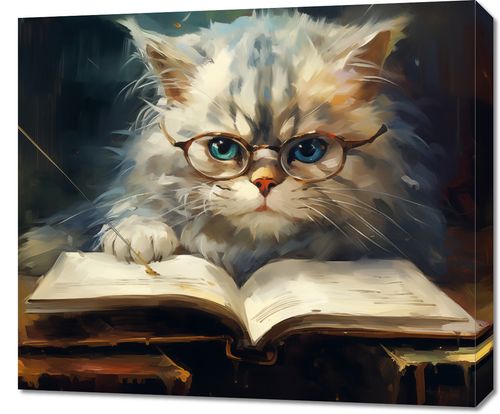 Obraz z serii abstrakcja zatytułowany Ucz Się Ucz. Plakat prezentuje uroczego, puszystego kota rasy perskiej, który z zadumą spogląda przez okulary w stylu vintage, przypominające okulary profesora. Kot wydaje się być zanurzony w lekturze otwartej książki, której strony delikatnie dotyka łapą. Całość jest utrzymana w ciepłej, złotej kolorystyce, co nadaje scenie przytulny, kameralny nastrój. Obraz ma charakter impresjonistyczny, z widocznymi pociągnięciami pędzla, które dodają dynamizmu i tekstury. Ten obraz idealnie wpasowałby się w atmosferę bibliotek, zakątków do czytania, a nawet jako dekoracja w salonach lub gabinetach, dodając wnętrzu intelektualnego charakteru i ciepła.