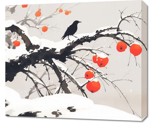 Obraz z serii motywy wschodnie zatytułowany Wschodnia Akwarela przedstawia zimowy krajobraz w stylu wschodnim. Drzewo o ciemnych, wyrazistych gałęziach pokrytych śniegiem wygina się elegancko na tle spokojnego, jednolitego tła. Na gałęziach znajdują się czerwone owoce, które mogą być symbolem persymonów lub innych zimowych owoców, kontrastujących swoim żywym kolorem z zimowym otoczeniem. Na jednej z gałęzi spoczywa czarny ptak, być może kruk, co dodaje życia i głębi kompozycji. Spadające płatki śniegu i subtelne odcienie w tle nadają scenie uczucie spokoju i ciszy. Ten obraz łączy prostotę z elegancją, mogąc stanowić wyrafinowaną dekorację w przestrzeniach szukających spokojnej, lecz wyrazistej estetyki.