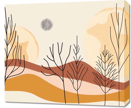 Obraz z serii boho zatytułowany Wydarta Pustynia. Przedstawia on abstrakcyjne, delikatne drzewa na tle pastelowych, organicznych kształtów i ciepłych odcieni zachodu słońca. Subtelna gra kolorów i tekstur tworzy wizję cichej, spokojnej przestrzeni. Różne odcienie i wielkości kolistych form mogą symbolizować słońca lub księżyce, dodając głębi i zainteresowania kompozycji. Ten obraz doskonale odnajdzie się w przestrzeniach, które cenią sobie spokój i harmonię. Jest idealny do dekoracji wnętrz, takich jak salon, sypialnia czy miejsce przeznaczone do medytacji i odpoczynku, oferując delikatne, lecz wyraziste akcenty kolorystyczne.