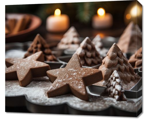 Obraz z serii święta zatytułowany Zimowa Przyprawa, to obraz, który przenosi widza do serca domowego ciepła podczas świątecznego sezonu. Kompozycja przedstawia piernikowe gwiazdy i choinki posypane śnieżnobiałym cukrem pudrem, ułożone obok migoczących świece, które dodają scenie ciepłego blasku. W tle, ciemne, bogate kolory i subtelną głębię sceny zapewniają aromatyczne przyprawy jak cynamon i anyż. Ten plakat to kwintesencja świątecznej atmosfery, idealny do zawieszenia w kuchni lub jadalni, przynosząc nutę świątecznej radości i spokoju do każdego domu. Idealnie sprawdzi się także jako dekoracja w kawiarniach lub restauracjach, które chcą podkreślić swoją świąteczną ofertę.