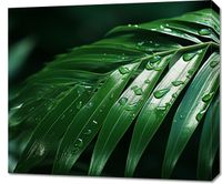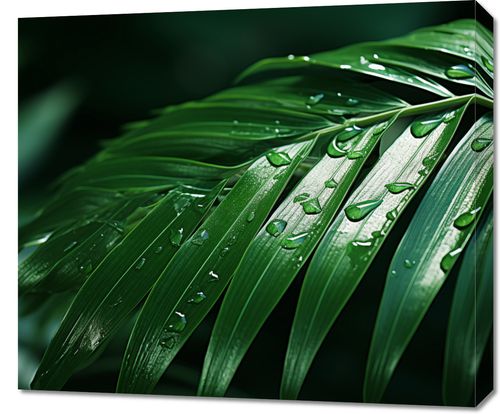 Obraz z serii natura zatytułowany Żywa Łagodność, przedstawia szczegółowe zbliżenie na liście palmy w odcieniach żywej zieleni, oświetlone promieniami słońca przenikającymi przez ich szpary. Gładkie i lśniące liście, z delikatnymi kroplami wody na ich powierzchni, tworzą poczucie ruchu i dynamiki, podczas gdy ich kontrastujące linie i formy wnoszą element struktury i elegancji. Delikatne światło i cienie na liściach, w połączeniu z bogatą paletą zieleni, wywołują uczucie spokoju oraz bliskości z naturą. Ta fotograficzna kompozycja mogłaby doskonale uzupełnić wnętrza, które cenią naturalność i organiczną estetykę, takie jak eko-salon, przestrzeń do jogi lub biura koncentrujące się na zrównoważonym rozwoju i ekologicznych inicjatywach.