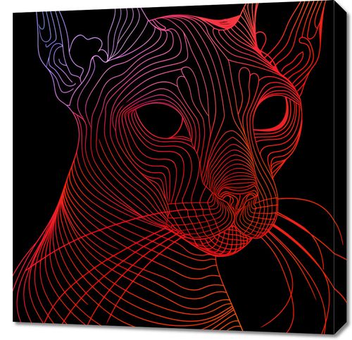 Obraz z serii pop art zatytułowany Cyfrowa Kocica przedstawia futurystyczny wizerunek kota sfinksa, wykonany za pomocą płynnych, abstrakcyjnych linii w odcieniach czerwieni i pomarańczu na głębokim, czarnym tle. Wzór linii tworzy iluzję trójwymiarowości i ruchu, podkreślając wyraziste cechy kociego profilu, takie jak duże uszy, wyłaniające się oczy i charakterystyczne rysy twarzy. Minimalistyczne użycie koloru i linii w kontraście z ciemnym tłem nadaje dziełu nowoczesny wygląd, który przyciąga wzrok i pobudza wyobraźnię. Ten artystyczny obraz świetnie wpisze się w wnętrza o nowoczesnym designie, szczególnie wśród miłośników zwierząt i miłośników sztuki cyfrowej, nadając przestrzeni odrobinę współczesnego stylu i kociego wdzięku.