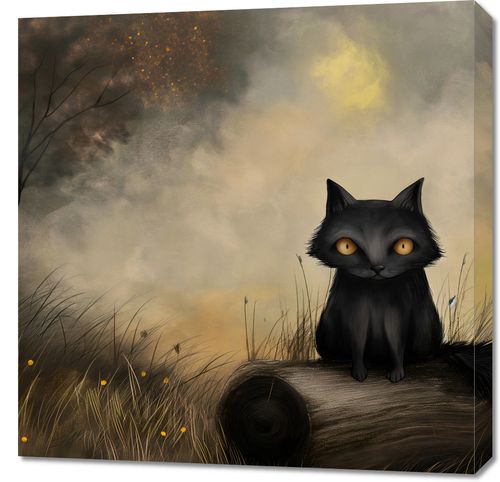 Obraz z serii abstrakcja zatytułowany Czarny Kot. Przedstawia on czarnego kota o hipnotyzujących, złotych oczach, siedzącego na polanie w ciepłych promieniach zachodzącego słońca. Drzewo o gołych gałęziach i delikatne światła odbijające się w tle tworzą atmosferę tajemniczości i spokoju. Złote i brązowe odcienie sceny, połączone z subtelnymi akcentami świetlnymi, nadają ilustracji uczucie ciepła i spokojnej zadumy.Ten obraz będzie doskonałym dodatkiem do wnętrz, które pragną wprowadzić element spokoju i kontemplacji, idealny do salonu, sypialni czy gabinetu. Zapewnia on poczucie towarzystwa i spokoju, wprowadzając do pomieszczenia ciepło i urok wieczornej aury.