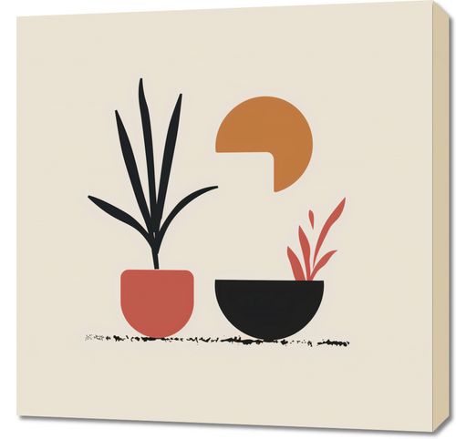 Obraz z serii boho zatytułowany Domowy Ogród. Obraz łączy proste, geometryczne formy roślin z ciepłą kolorystyką, tworząc przytulny obraz domowego ogrodu. Czerwony i czarny wazon z roślinnością wyrastają nad delikatną linia ziemi, przywołując obrazy spokojnego wnętrza. Niedokończony półksiężyc w kolorze pomarańczowym dodaje kompozycji delikatności i podkreśla domową atmosferę. Dzieło doskonale nadaje się do miejsca, które ma być oazą spokoju i relaksu, takiego jak sypialnia lub cichy kącik do czytania. Jego proste i spokojne kolory mogą również przynieść harmonię do miejsca pracy lub studiowania, promując skupienie i spokój.