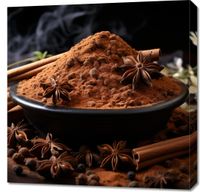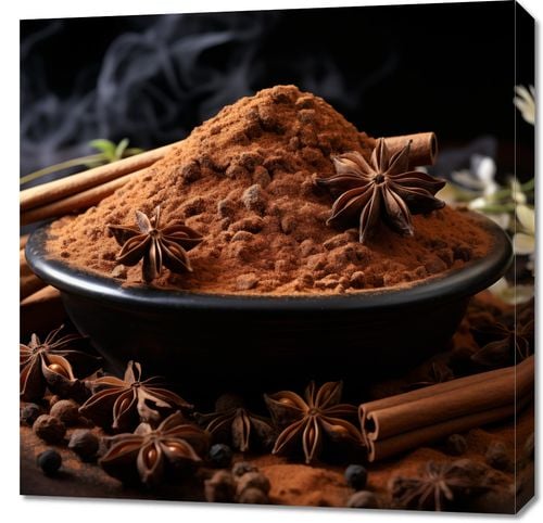 Obraz z serii święta zatytułowany Esencja Aromatu. Mocny akcent na kompozycję przypraw z cynamonem, anyżem i ziarnami pieprzu rozsypanych wokół miski pełnej mielonego cynamonu, tworzący wzór przypominający sztukę natury, wyróżnia się zarówno prostotą, jak i głębią. Delikatny dym unoszący się nad przyprawami dodaje atmosfery ciepła i domowego ogniska. Ten obraz idealnie komponuje się z kuchniami o bogatym, ziemskim wystroju, jak również z eleganckimi restauracjami oferującymi etniczną kuchnię, gdzie podkreśli uczucie przytulności i tradycji.