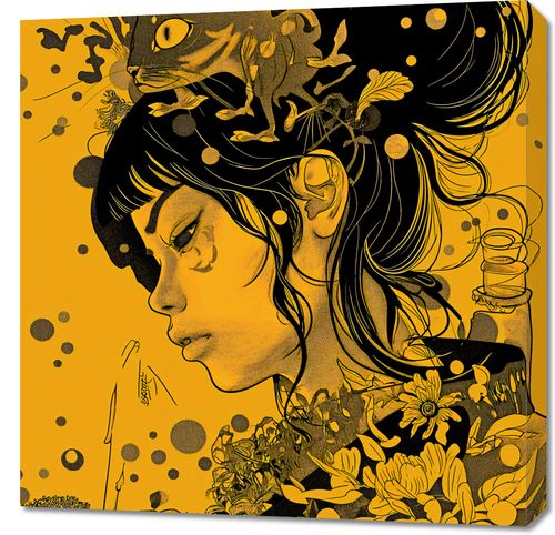 Obraz z serii motywy wschodnie zatytułowany Jedność prezentuje profil portretu młodej kobiety, którego kontury i przestrzeń wokół są wypełnione bogatym, złożonym motywem fauny i flory. Czarno-złota kolorystyka na tle w odcieniach musztardowego żółtego tworzy głęboki kontrast, który przyciąga wzrok i zmusza do refleksji. Włosy kobiety przechodzą w gęstą dżunglę roślin i zwierząt, symbolizując jedność z przyrodą. Wizualnie wyraziste i symbolicznie nasycone, dzieło artystyczne wydaje się idealne do wystroju nowoczesnych przestrzeni mieszkalnych lub miejsc publicznych, które chcą podkreślić związek z naturą i sztuką. Może być również doskonałym dodatkiem do galerii lub przestrzeni artystycznych, które cenią sobie oryginalność i głębię wizualną.