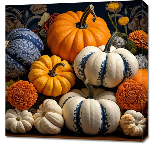 Obraz z serii natura zatytułowany Jesienne Bogactwo. Ta kompozycja to celebracja urodzaju jesieni, ukazująca bogactwo i różnorodność dyń w pełnej krasie. Kontrastujące faktury i kolory od kremowej bieli do głębokiej pomarańczy są uzupełnione o ciepłe odcienie złotych kwiatów, tworząc obraz, który emanuje ciepłem i domową atmosferą. Idealny do dekoracji kuchni lub jadalni, gdzie może inspirować do sezonowych przetworów i przygotowań świątecznych potraw. Ten obraz będzie również doskonałym dodatkiem do przestrzeni takich jak sklepy z dekoracjami domowymi, kawiarnie lub restauracje, które chcą wprowadzić atmosferę przytulności i naturalnego piękna.