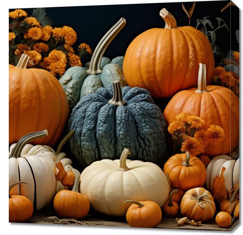 Obraz z serii natura zatytułowany Jesienne Urodzaje przedstawia bujne bogactwo jesieni. Centralne miejsce zajmuje soczysta, pomarańczowa dynia, królowa jesieni, otoczona przez różnorodność jej barwnych odmian. Niebieskawe i białe dynie tworzą wyjątkowy kontrast, a wszystko to uzupełnione jest przez złociste i burgundowe chryzantemy, które dodają kompozycji ciepła i głębi. Całość osadzona jest na tle w klasycznych, ciemnych odcieniach, co podkreśla elegancję i dojrzałość sezonu. Obraz ten idealnie wpasuje się w przestrzeń kuchni lub jadalni, dodając jej charakteru oraz ciepłego, domowego klimatu. Doskonale odnajdzie się także w przestrzeniach takich jak winiarnie czy restauracje serwujące sezonowe dania, gdzie podkreśli bogactwo i obfitość jesiennej palety smaków.