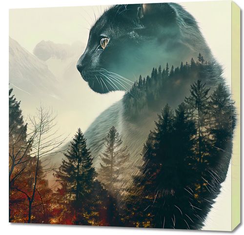 Obraz z serii natura zatytułowany Koci Duch Lasu. Ten obraz prezentuje zaskakującą kompozycję, w której sylwetka czarnego kota płynnie przechodzi w mglisty krajobraz leśny, łącząc świat zwierzęcia z dziką przyrodą. Złote i ciepłe odcienie jesiennego lasu w tle kontrastują z chłodnymi tonami gór, dodając głębi i tajemniczości. Mistyczne połączenie kota z naturą symbolizuje jedność i harmonię między żywymi istotami a otoczeniem, a także podkreśla dziką i niezależną naturę kota. Obraz idealnie nadaje się do przestrzeni mieszkalnych ceniących połączenie sztuki z naturą, takich jak nowoczesne salony, pokoje relaksacyjne lub gabinety, jak również może być inspirującym elementem dekoracyjnym dla gabinetów weterynaryjnych lub przychodni zoologicznych.