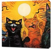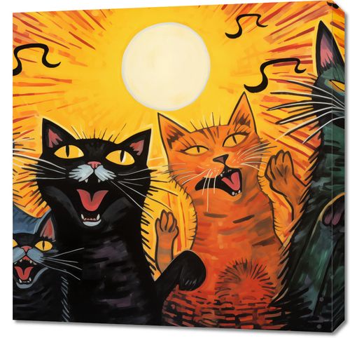 Obraz z serii abstrakcja, zatytułowany Kocie Koncertowanie. Ta dynamiczna i zabawna ilustracja przedstawia grupę kotów, które z entuzjazmem śpiewają lub miauczą w towarzystwie wschodzącego słońca, tworząc poczucie ruchu i życia. Intensywne kolory, wyraziste linie i humorystyczne wyraz twarzy kotów sprawiają, że dzieło to jest pełne energii i charakteru. Obraz jest idealnym dodatkiem do każdego pomieszczenia, szczególnie tam, gdzie chcemy dodać odrobiny ciepła, humoru i barw. Świetnie sprawdzi się w pomieszczeniach wspólnych, pokojach dziecięcych, a także w przestrzeniach kreatywnych lub jako prezent dla miłośników kotów.