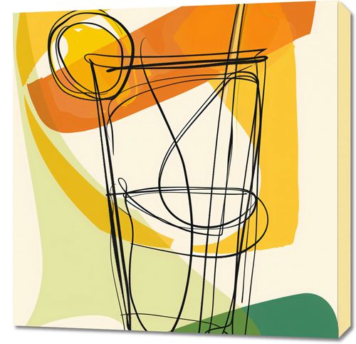 Obraz z serii boho zatytułowany Koktajl Artystyczny to kreatywne połączenie kolorów i linii, które razem tworzą abstrakcyjne przedstawienie szklanki z napojem. Dynamiczne, czarne kontury rysują się swobodnie, sugerując kształt i formę, podczas gdy tło w ciepłych odcieniach żółci i pomarańczy z nutą zieleni dodaje kompozycji letniego klimatu. Ten obraz przyciąga uwagę swoją swobodą formy i świeżością, nadając wnętrzu poczucie radosnej, niezobowiązującej atmosfery. Idealny dla tych, którzy chcą dodać swojemu otoczeniu odrobiny kulinarnego szaleństwa i artystycznego smaku.