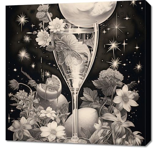 Obraz z serii wnętrza zatytułowany Kosmiczny Eliksir. Niesamowita kompozycja przedstawiająca kieliszek, z którego wylewa się galaktyczny nektar, otoczony kwiatami i roślinami w monochromatycznych barwach. Centralnym punktem jest lśniąca pełnia księżyca, której blask odbija się w szkle, tworząc atmosferę tajemnicy i magii. Gwiazdy migoczą w tle, nadając całości głębokiego, nieskończonego wymiaru. Delikatne linie i szczegóły graficzne wzbogacają kompozycję, czyniąc ją idealnym wyborem do nowoczesnych salonów, galerii sztuki oraz miejsc o tematyce astronomicznej.