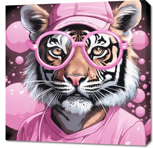 Obraz z serii pop art Ludzki Tygrys. Na obrazie widzimy głowę tygrysa, który jest ubrany w stylizowany, ludzki sposób. Tygrys ma na sobie różową czapkę z daszkiem oraz okulary w tym samym kolorze, co dodaje mu ludzkiego charakteru. Tło obrazu jest proste, pokryte bąbelkami w różnych odcieniach różu, co tworzy zabawny i lekko surrealistyczny klimat. Ten kolorowy i kreatywny projekt może przyciągnąć uwagę w różnorodnych przestrzeniach, od młodzieżowych pokoi po galerie sztuki. Jest to doskonały przykład współczesnego połączenia natury i kultury pop, który może być tematem rozmów i oryginalnym elementem dekoracyjnym.