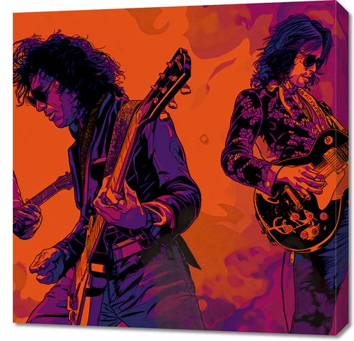 Obraz z serii pop art zatytułowany Mamy To Flow. Obrazuje trzech gitarzystów zanurzonych w pasji muzyki, z instrumentami w rękach, oddając ducha rock'n'rolla. Intensywne kolory, w tym głębokie odcienie pomarańczu i fioletu, tworzą tło, które pulsują energią i rytmem. Obraz oddaje esencję koncertowej atmosfery i jest hołdem dla klasycznych rockowych wirtuozów. Znakomicie wpasuje się w przestrzenie kulturalne, takie jak sale koncertowe, studia muzyczne, jak również jako żywiołowy akcent dekoracyjny w młodzieżowych pokojach czy salonach miłośników muzyki.