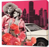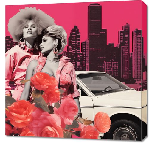 Obraz z serii pop art zatytułowany Metropolitalne Divy. Ta stylowa kompozycja łączy dynamikę miejskiego życia z vintage glamour, prezentując dwie kobiety w modnych strojach w tonacji różu, które emanują siłą i elegancją. Ich fryzury i dodatki nawiązują do lat 70. i 80., wprowadzając do obrazu powiew nostalgi. W tle widoczne są charakterystyczne dla wielkiego miasta sylwetki drapaczy chmur, wszystko utrzymane w wyrazistej, różowej kolorystyce, która nadaje plakatowi wyjątkowego charakteru. Na pierwszym planie, między postaciami, widnieje klasyczny samochód i bujny kwiat róż, dodający kompozycji romantycznej aury. Idealny dla wnętrz inspirowanych modą retro oraz dla miłośników miejskiego sznytu.