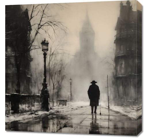 Obraz z serii wnętrza zatytułowany Mgła nad Londynem, przedstawia samotną sylwetkę przechadzającą się po mokrych, połyskujących bruku ulic, otoczoną przez klasyczne kamienice i latarnie uliczne, które rzucają cień na mglistą scenę. Szarości i sepii użyte w dziele podkreślają jego vintage charakter, a zarys wieży w tle przywołuje ikoniczny obraz Londynu. To dzieło sztuki idealnie wpasuje się w przestrzenie, gdzie chce się wywołać atmosferę tajemniczości i klasyki, takie jak biblioteki, salony w stylu retro, czy klasyczne biura prawnicze, zapewniając im wyrafinowany, metaforyczny akcent.