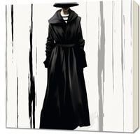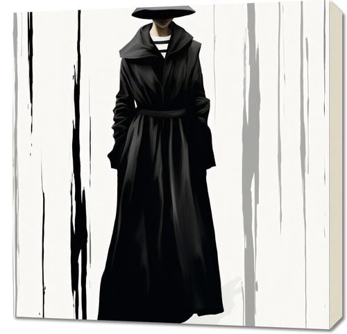 Obraz z serii wnętrza zatytułowany Mroczna Taina. Enigmatyczna postać w czarnym płaszczu i szerokim kapeluszu ukrywa swoją tożsamość, podkreślając aura tajemniczości. Czarno-białe tło z pionowymi smugami przypominającymi deszcz lub płynący atrament dodaje głębi i dramatyzmu kompozycji. Subtelne niuanse światła i cienia grają na powierzchni płaszcza, tworząc atmosferę intrygi i nieokreślonego niebezpieczeństwa. Świetnie sprawdzi się w nowoczesnych galeriach sztuki, luksusowych hotelach o minimalistycznym designie oraz w przestrzeniach przeznaczonych dla miłośników noir i kryminałów.