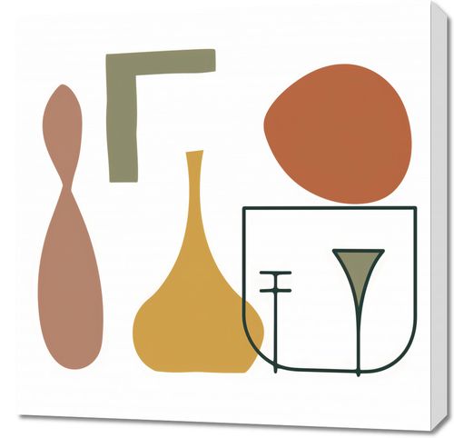 Obraz z serii boho zatytułowany Naczynia. Obraz prezentuje kolekcję abstrakcyjnych form, które przypominają różne przedmioty od naczyń po elementy dekoracyjne, tworząc estetyczną mieszankę linii i kształtów. Zestawienie spokojnych, pastelowych barw z silnymi, geometrycznymi figurami tworzy wizualnie przyjemną kompozycję, która zwraca uwagę swoją subtelną elegancją. To dzieło artystyczne jest doskonałym wyborem dla wnętrz o nowoczesnym designie, w których chcemy wprowadzić sztukę bez dominujących nad przestrzenią. Idealnie sprawdzi się jako delikatny akcent w przestronnym salonie, biurze czy jako część galerii w domowym korytarzu.